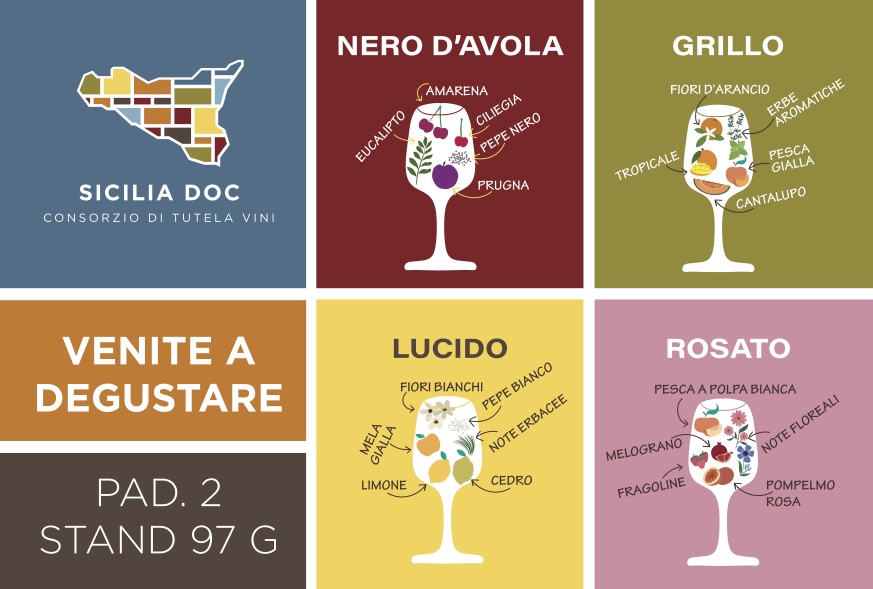Nel nostro spazio, Stand 97G del Padiglione 2, avremo la possibilità di far degustare i vini Doc Sicilia dei nostri produttori, ma soprattutto di dedicare specifici momenti di approfondimento ai vitigni più rappresentativi dell’isola, in particolare il Nero D’Avola, il Grillo, il Lucido e anche un focus sui rosati siciliani.